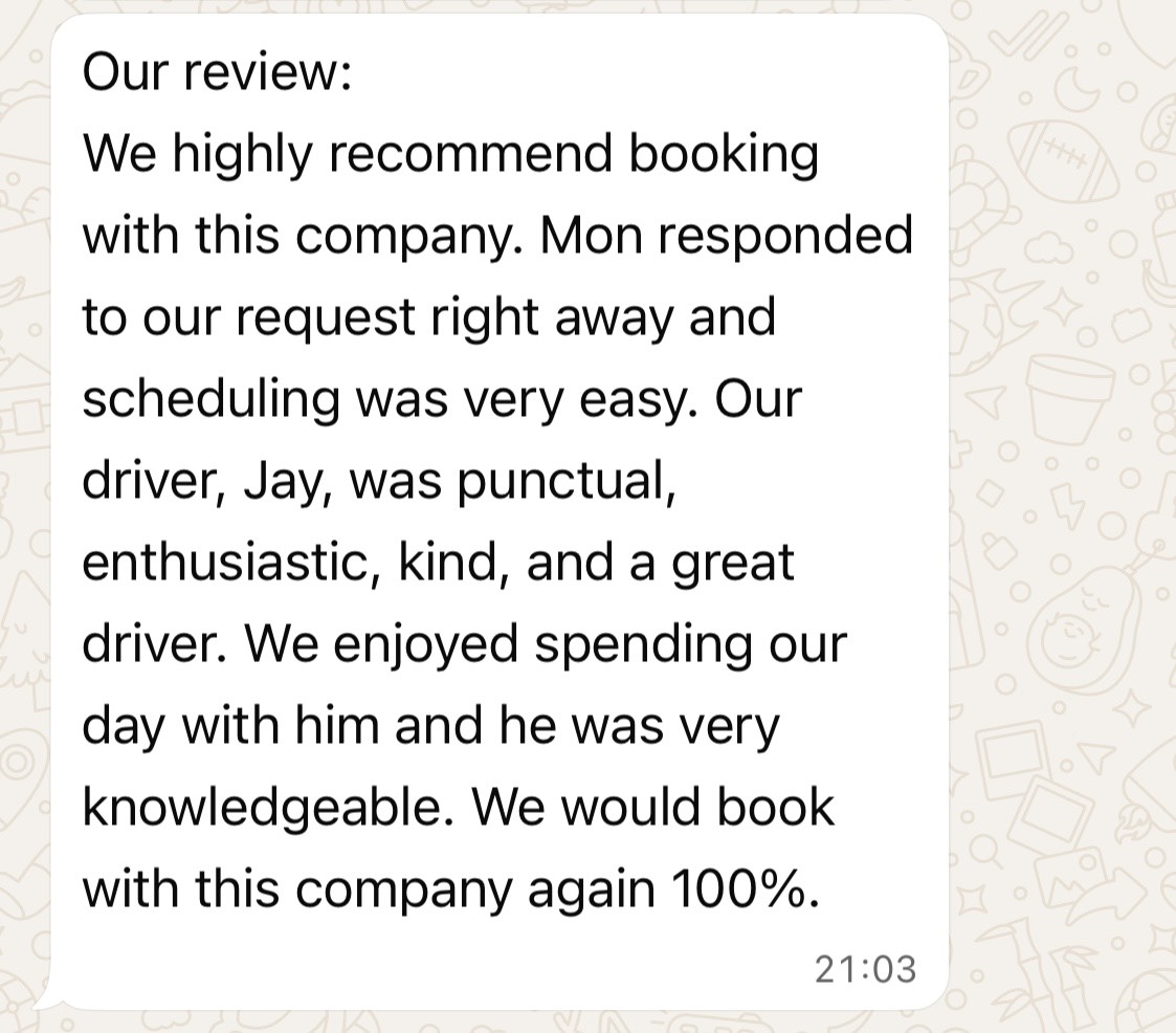 Communication matters when you travel. That’s why we guarantee a private driver speaking English to make your trip simple and stress-free. Our drivers explain attractions, recommend restaurants, and guide you with local knowledge—all in fluent English. “Having an English-speaking driver in Chiang Mai was like traveling with a local friend who knew every corner of the city.” – Happy Guest